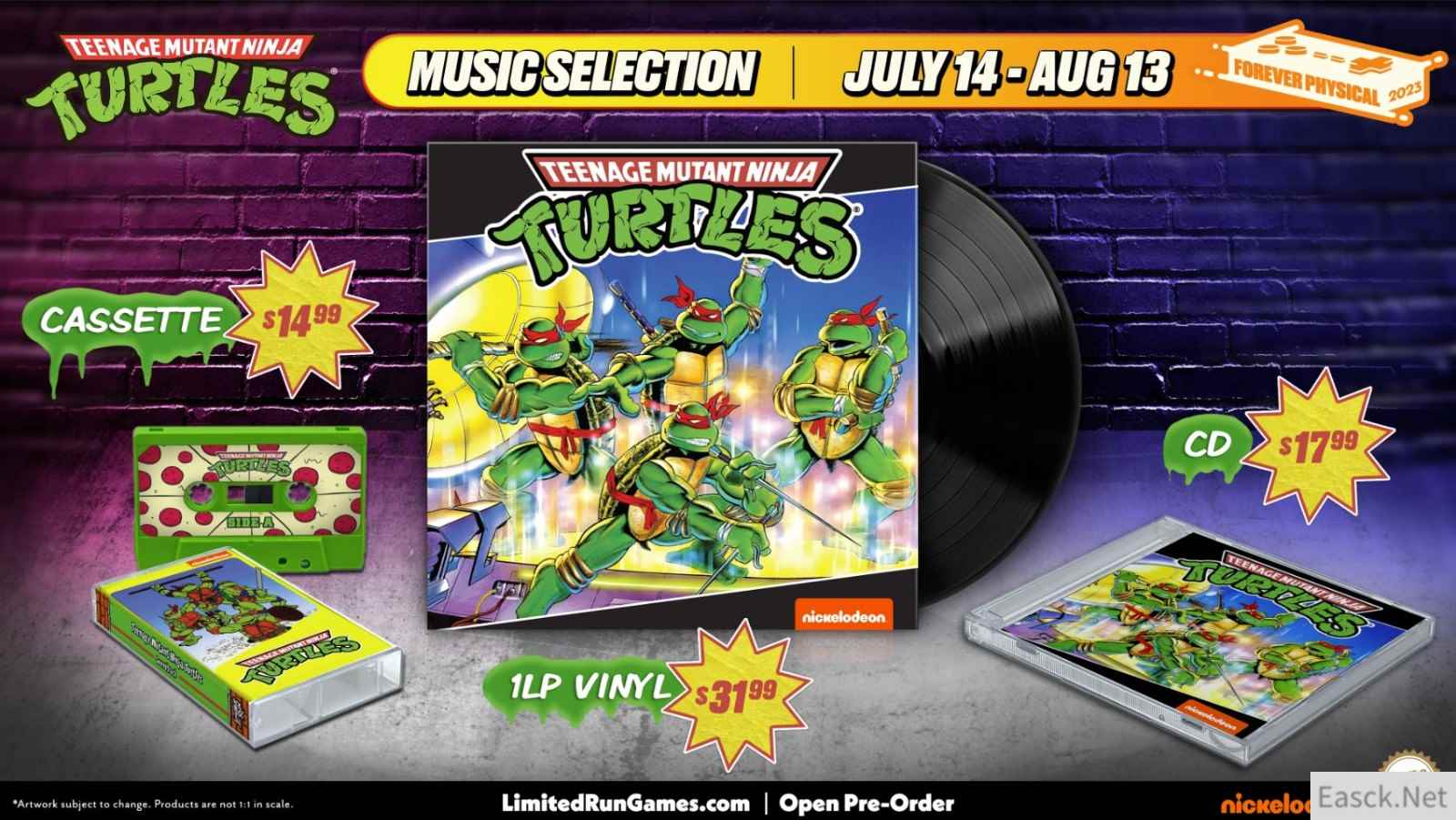 根据Limited Run Games介绍,从7月份开始,该公司将保持每个月推出一部忍者神龟游戏原声的节奏,陆续推出包含FC、GB、SFC、街机等各个平台来自Konami的忍者神龟系列游戏音乐原声带。买家可以从磁带、CD和唱片三种媒体任意选择,或者选择价格最高,但是特别有忍者龟风格的绿色唱片!