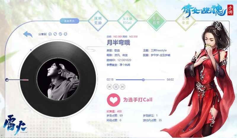 【众歌王齐争霸 四强现身舍我其谁!】 倩女歌王争霸赛开办以来,三界可谓热闹非凡,才华横溢的倩女玩家纷纷报名参赛,想要在歌王争霸赛上大展歌喉。经过层层筛选,最终爱唱歌的女帮主【葡萄小仙】,在杭州工作的女律师【拾、壹】,世界频道常驻歌手【俊羽】和自称没有故事的【凉风、有信】,凭借自己的实力,进入歌王争霸赛前四强。他们将分别为大家带来《说散就散》、《海棠》、《天后》和《月半弯》,准备好今晚给耳朵来一场音乐的按摩了么?