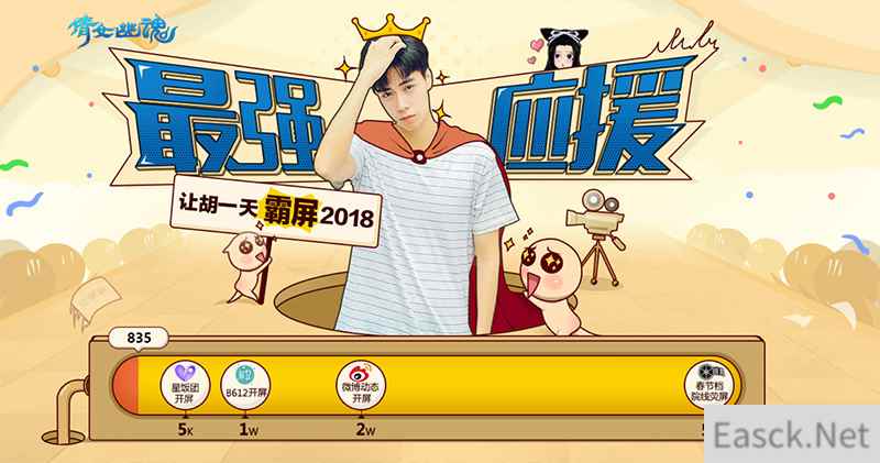 【2018最强应援 为人气男神疯狂打CALL 】 认真拍摄微电影、倾情示范动作,守护美好的胡一天,当然值得麻将们的热爱!麻将们不仅能在游戏中向男神表白,还能为男神疯狂打CALL应援。为了回馈麻将们,倩女手游特地推出2018胡一天应援活动!只要玩家在游戏中达到30级,就能在2月13日之前,每天为胡一天应援一次。应援人数达到5000,胡一天将登上星饭团APP开屏画面。应援人数达到1万和2万,麻将们将分别在B612和新浪微博的开屏广告中看到胡一天的身影。如果应援人数达到5万,倩女幽魂手游将斥巨资买下春节档热门院线的开画广告,只要你去看电影,就有机会和家人、闺蜜、爱人、朋友,一起看到胡一天!还等什么,快为自己的爱豆,疯狂打call吧!