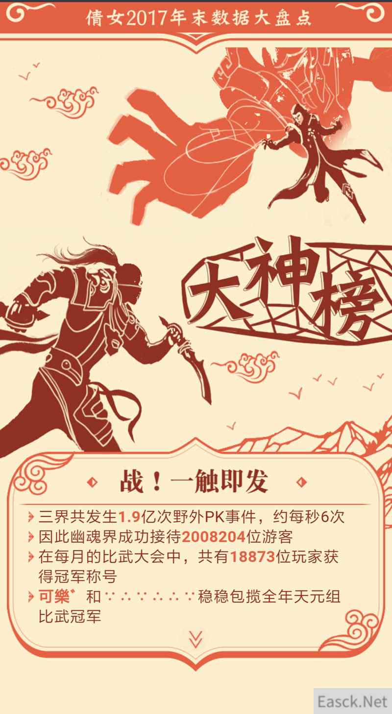 其实大数据还向玩家揭示了不少有趣的数据:玩家【画无心卍】化身欧皇,一年中暴鬼278个; 2017年度最畅销的时装和坐骑竟是【清溪】和【喜鹊闹春】;一年内倩女玩家刷掉1900多万个喇叭!除了这些,倩女年度大数据还有什么密秘呢?一切等你来探寻!