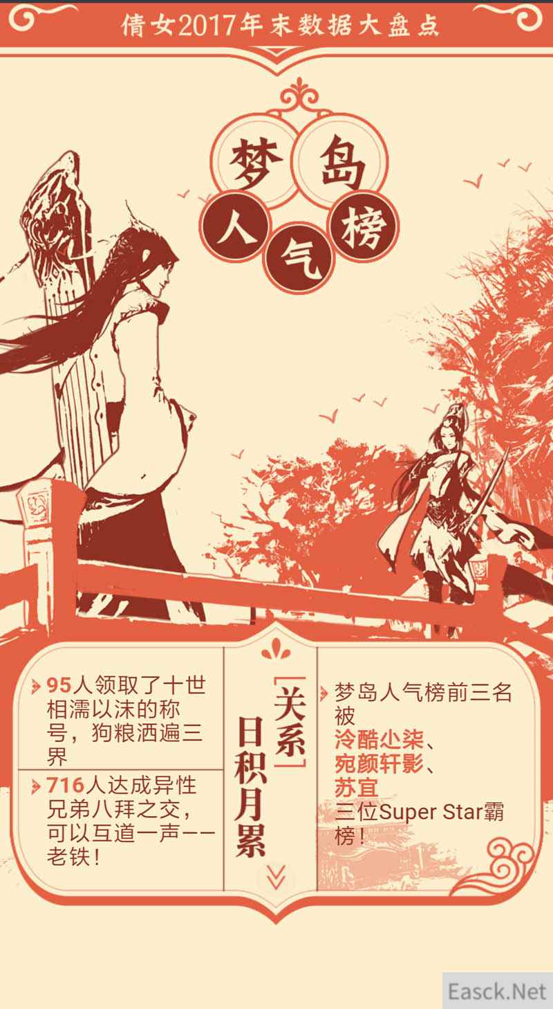 除了侠侣名园,大数据还盘点了倩女手游三界中的风云人物,【泠酷小柒】、【宛颜轩影】和【苏宜】三位玩家包揽了梦岛人气的前三甲。不知道这三位玩家里有没有你的偶像呢?