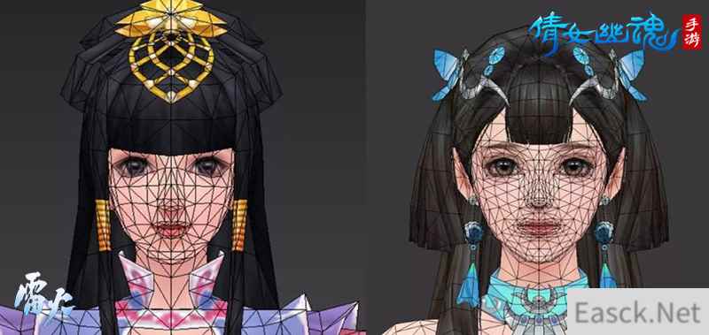 【细节制胜,半透明材质凸显气质】 颜值的提升是玩家对于仙体最直观的感受,然而对于开发者而言,看到的更多是细节上的改变。将人物模型在3D Max软件中打开后,模型面部的细线直观的展示出了建模面数的明显提升。相对于以往,人物的皮肤更具有质感,而且在细节的地方得到了大幅度的提升,其中鼻子和眼睛的提升最为显著。因为有了更多层数,人物的眼睛做出的光泽感更加真实,同时在鼻梁和脸颊等方面立体感也有很大提升,这一切都让仙体的颜值更加突出。