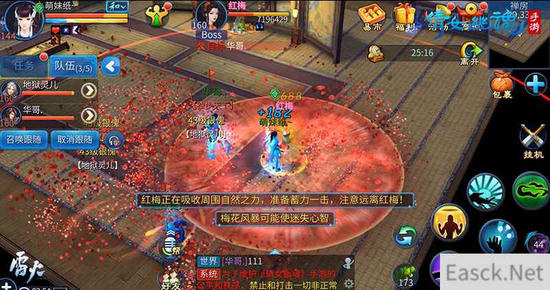 红梅的技能覆盖范围较广,玩家在对战中要尽量拉开与其之间的距离,同时她还会周期性的发起吹气攻击,并有几率召唤出梅花风暴,这时玩家需要谨慎走位,避免被梅花风暴魅惑。当红梅的血量低于40%时,她还将施展威力强大的蓄力一击。