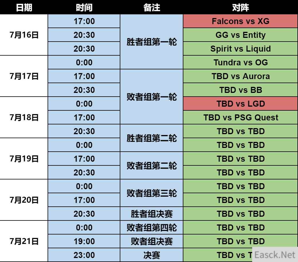 败者组晋级战队: Aurora LGD Quest BB 淘汰战队: HEROIC Blacklist bc MOUZ 利雅得大师赛淘汰赛将在7月16日17:00开始,首场比赛XG.WBG对阵Falcons,败者组LGD的比赛将于7月18日00:00开始。