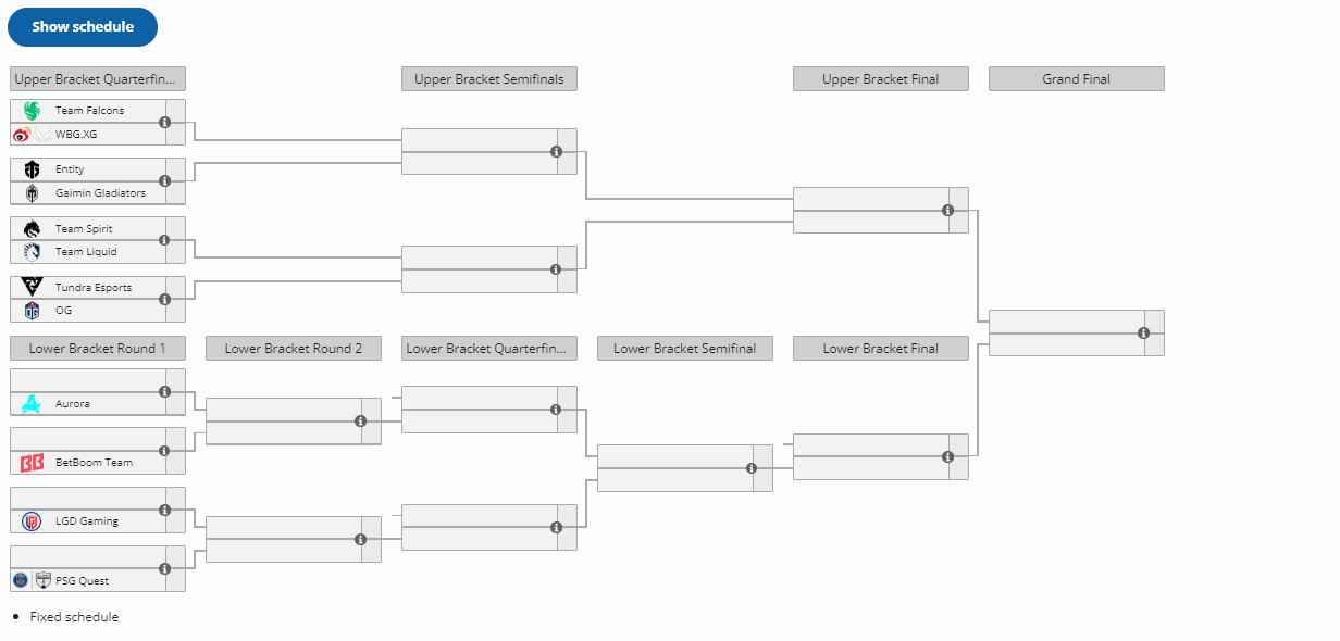 利雅得大师赛小组赛全部结束,4支战队淘汰,剩余12支战队将进行淘汰赛的较量。 胜者组晋级战队: Falcons Spirit GG OG Tundra Entity Liquid XG.WBG