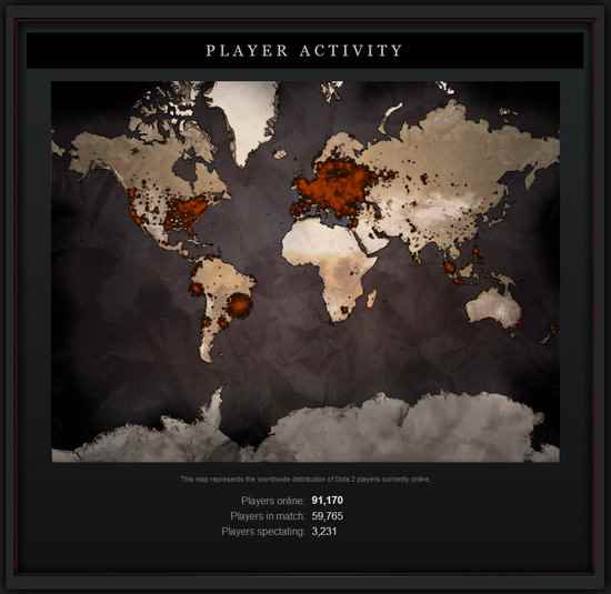 今天,DOTA2再度对客户端进行了更新,增加了新英雄斯拉克。通过近期的一张游戏全球热点图可以看出,DOTA2全球在线玩家约9万,游戏玩家约6万。