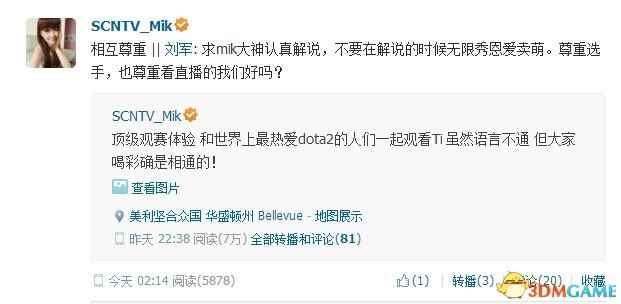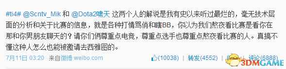 王思聪也和许多宅男一样喜欢DOTA2,热爱祖国热爱游戏,而且也熬夜观看西雅图直播,不同之处是他爸爸是中国首富王健林,他对于两位现场情侣解说,Mik和啸天,非常不满。