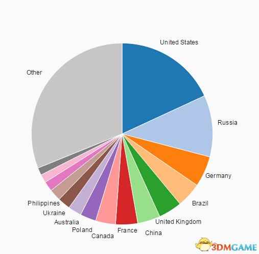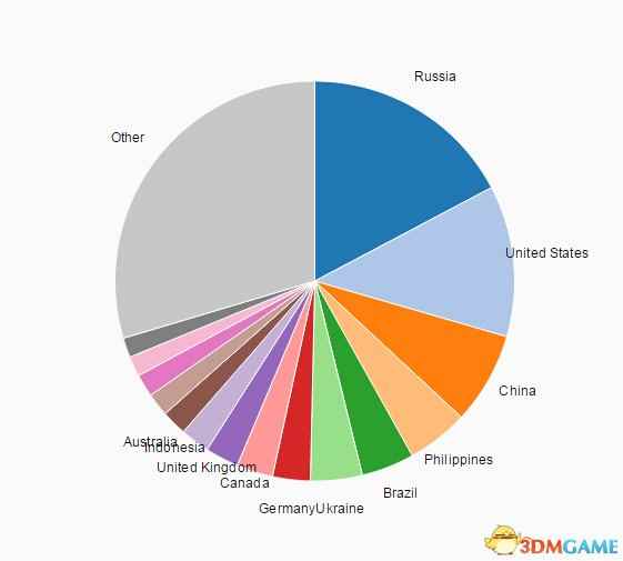 接下来看下《Dota2》的中国总占有率,国内玩家也确实很争气,当然也跟国内电竞日益普及有关,《Dota2》中国玩家占全世界总数的7.39%,目前排行第三,其它两位分别是美国和排名第一的俄罗斯(17.33%)。