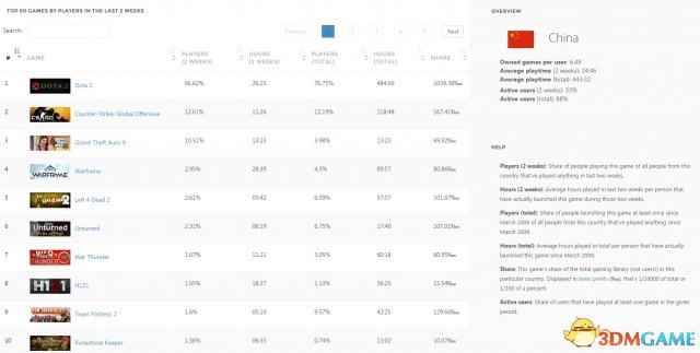 该数据统计来自于知名网站SteamSpy,在排行中详细的列出了中国玩家们的游戏持有度。该网站给出的数据分别是2周内玩家持有率(PLAYERS 2 WEEKS)以及2周内的平均游戏时长(HOURS 2 WEEKS),玩家总持有(PLAYERS TOTAL)和总平均在线时长(HOUS TOTAL),最后则是分享率(SHARE)。 其中位居榜首的是《Dota2》,不过因为《GTA5》上市的关系,《Dota2》近两周的持有率下降了9个百分点,两周内的平均在线时长为26:57个小时(平均每个《Dota2》玩家在这两周内玩了27个小时左右)。目前该游戏扔以76.75%总占有率位居第一。 而位居第二的则《CS:GO》,这款久居销量榜的小强并没有被《GTA5》的上市而受到冲击,近两周反而增加了0.76%的的百分点,两周内的平均在线时长为11:09个小时,游戏总计时长不到《Dota2》的一半,总之是中规中矩。 位居第三的则是R星大作《GTA5》,这里需要说明的是SteamSpy给出的排名是2周排名,而《GTA5》上市不到一周,所以下周该游戏的排名还会有变化,目前来说,从14号到今天,《GTA5》的持有率达到了7.62%,平均小时时间为10.31个小时,总的玩家持有率则是达到了2.84%可谓是上升最快的游戏了。 然后再来看下总榜的分布图,在总榜方面,中国的Steam玩家游戏持有率以4.03%位居世界第六,仅次于英国的4.17%,之后是巴西、德国、俄罗斯以及、美国(游戏持有率为18.11%)。