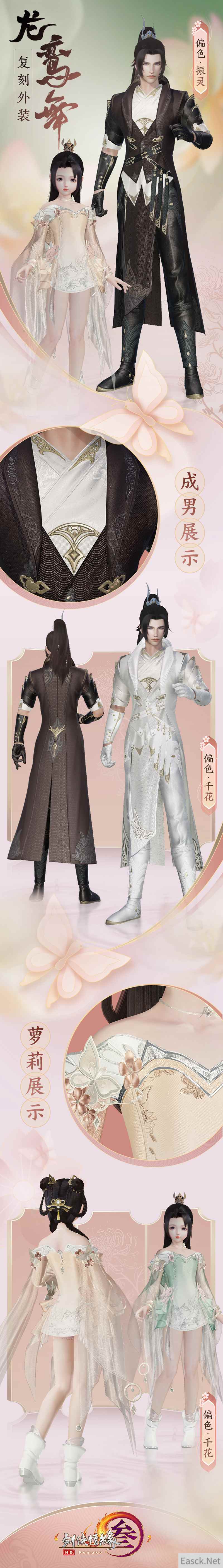 【绝美外装复刻 “龙鸾舞”一舞霓裳】 与此同时,另一块复刻外装“龙鸾舞”今日也同步亮相。两款偏色各具特色,在设计上保留原版特色,并增添了更多精彩之处!成男款衣衫干练,一身短打劲装透露出潇洒之意,金饰点缀更加张扬!成女款落落大方,凸显身姿,手腕与腰侧蝴蝶纹饰点缀,彰显独特魅力!萝莉款短裙靓丽,色泽渐变韵味十足,繁花搭配蝴蝶,在半透袖摆的掩映下,好似蝶舞百花丛,宛若春日仙子!正太款则豪放不羁,短衫束腕给人以狂放之感,却在蝶饰点缀下又流露处柔美之意,一刚一柔相得益彰!