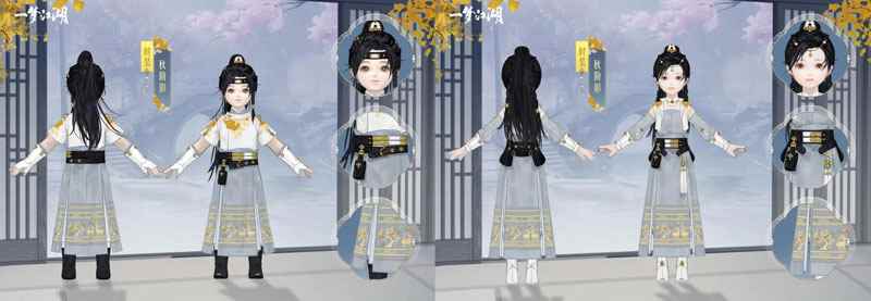 【时装·秋阶影】 时装“秋阶影”的设计构思和命名灵感源自于出清代曹雪芹的《薛宝钗咏白海棠》。珍重芳姿昼掩门,自携手瓮灌苔盆。胭脂洗出秋阶影,冰雪招来露砌魂。淡极始知花更艳,愁多焉得玉无痕。欲偿白帝宜清洁,不语婷婷日又昏。而这套全新秋日时装“秋阶影”恰好有着淡雅端庄的视觉感受,弟子们运用高级灰和金黄的绝佳色彩配比,营造了一种清朗的气质。 成男有着抹额元素设计,极具少年感。斜领巾不对称设计简约又时尚。领口运用了柿花作为装饰意象,象征秋日收获满满的喜悦气息。女侠的高马尾和小立领设计更显英姿,白色马甲配上高级灰长裙打底,巧妙地衬托了女侠飒爽的身姿。