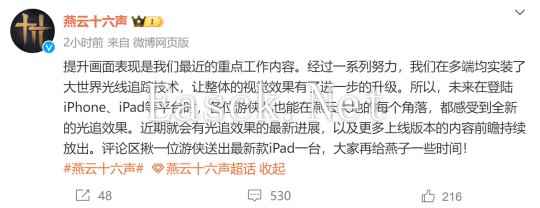国产武侠动作游戏《燕云十六声》官博宣称:“提升画面表现是我们最近的重点工作内容。经过一系列努力,我们在多端均实装了大世界光线追踪技术,让整体的视觉效果有了进一步的升级。所以,未来在登陆 iPhone、iPad 等平台时,各位游侠儿也能在燕云大地的每个角落,都感受到全新的光追效果。近期就会有光追效果的最新进展,以及更多上线版本的内容前瞻持续放出。” 这意味着《燕云十六声》在移动端比如 iPhone、iPad 上也有光追效果。