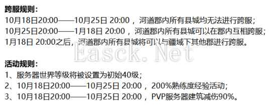 《帝国神话》国战版本“八王之乱”上线在即,随着新版玩法曝光,玩家期待值也愈发高涨,心中那份雄霸一方的梦想已被点燃,也许不用太长时间,国战的沙场之上会出现你的英姿,一骑当千! ● 本周五新服开放,限时活动助成长 《帝国神话》国服将于本周五(10月18日)将开放新郡-河道郡,新郡内首批开放4个县(3个PVE县-2个中州地图,1个东洲地图,1个PVP县-东洲地图)。考虑到新旧郡县实力差距,将加入全新跨服及活动规则,具体规则如下: