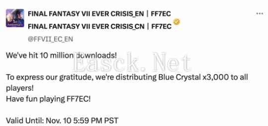 SE宣布《最终幻想7:永恒危机》全球下载量已突破1000万次!为了表达谢意,会向所有玩家发放3000蓝水晶。