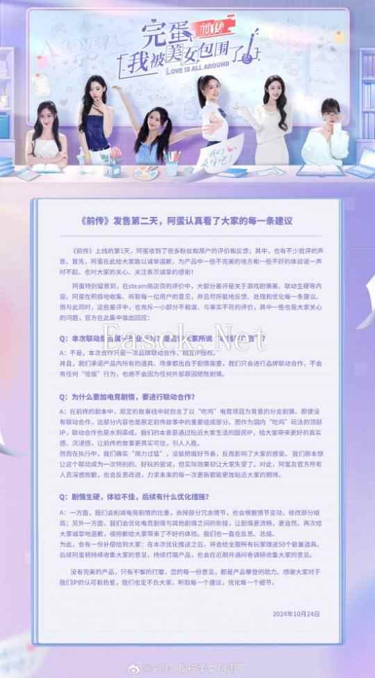 《完蛋!我被美女包围了前传》已经正式发售,然而首日上线便引发了大量玩家的反馈与争议。对此,游戏官方发表声明,向玩家致歉并回应了相关质疑,同时承诺将进行剧情优化。