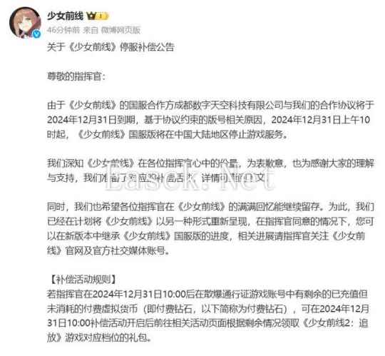 一直保持稳定更新节奏,甚至前两天才公布将与《暗区突围》联动的《少女前线》突然给游戏圈丢下了一剂“猛料”。 10月31日早上,散爆旗下二次元枪娘养成战术手游《少女前线》在官方渠道发布公告,宣布由于其与游戏国服版号代理方成都数字天空的合作协议将于今年12月31日到期,而基于协议约束的版号相关原因,《少女前线》国服也将于协议结束的当天正式停止运营。