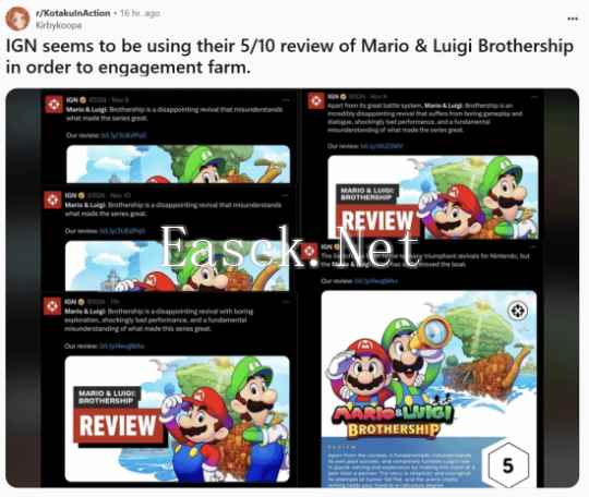 近日,一位Reddit网友发文批评IGN,认为IGN故意宣扬自己为《马里奥路易吉RPG:兄弟齐航》打了5分的低评分来吸引点击。该网友在帖子中附上了一张截图,内容为IGN在最近几天发布了数条有关《马里奥路易吉RPG:兄弟齐航》IGN5分的推文。