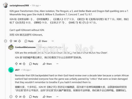 评论区的网友对此表达了不同的看法。一些网友列举了IGN在其他游戏中的评分,质疑其评分标准的不一致并表示:“没有IGN就不能拼写‘IGNorant’(无知)。” 另有网友引用了IGN过去对游戏的争议性评价,提到IGN在对《神之手》进行差评后多年才因受到某些人提醒,才承认该游戏遭到不公正评价。“我尊重评论者有自己的观点,但我不能接受的是,IGN反复发布同样的负面评论,只为吸引点击。”