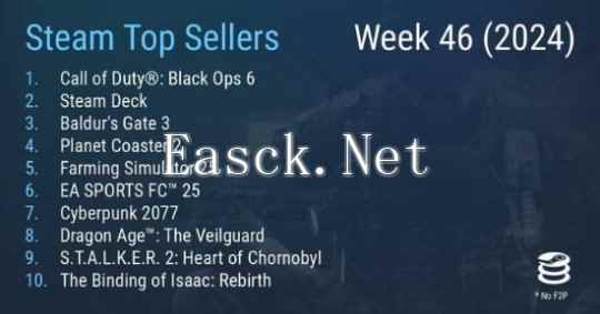 TOP10榜单如下: 1、《使命召唤:黑色行动6》 2、Steam Deck 3、《博德之门3》 4、《过山车之星2》 5、《模拟农场25》 6、《EA SPORTS FC 25》 7、《赛博朋克2077》 8、《龙腾世纪4:影障守护者》 9、《潜行者2:切尔诺贝利之心》 10、《以撒的结合:重生》 |