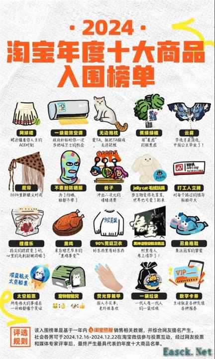 淘宝近日公布了2024年度十大商品榜单,其中《黑神话:悟空》的概念商品成功入选。榜单上的其他商品还包括丑鱼拖鞋、太空船票、一级能效空调、无边抱枕、谷子、蕉绿绿植、“不要脸”防晒服、打工人立牌、数字卡券等。这些商品都代表了2024年淘宝平台上最受欢迎和具有代表性的商品。