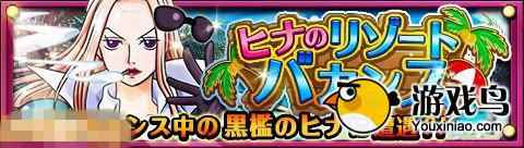 在Hina度假村活动中取得战斗胜利的话,便可以得到??Hina。果然,海军本部大佐的实力到底怎么样呢?而且,除了Hina以外,两铁拳フルボデ、翻身的ジャンゴ等等一些新角色也陆续登场。此外,这些游戏角色(奈美、两铁拳フルボディ、翻身的ジャンゴ、跳舞的ジャンゴ、Mr.2·ボン·クレ?、鬼人ギン、クロオビ)的必?技也可以顺利入手。