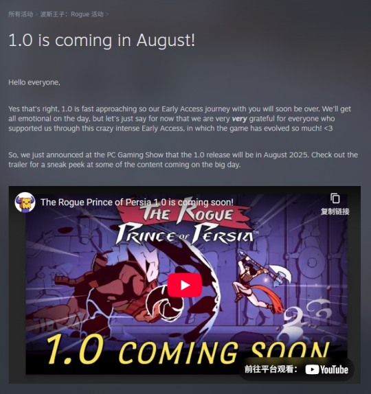 今日,发行商育碧与开发商Evil Empire共同宣布,横版肉鸽动作游戏《波斯王子:Rogue》将于8月脱离抢先体验阶段,在Steam平台推出PC正式版。该作最初于2024年5月27日开启抢先体验。 Evil Empire团队在针对1.0正式版发布的声明说道:“大家好,没错,1.0版本即将到来,我们与各位共同经历的抢先体验阶段也即将画上句号。虽然正式告别那天我们肯定会百感交集,但此刻请先允许我们向所有在这段紧张刺激的抢先体验期支持我们的玩家表达最诚挚的谢意——正是在你们的陪伴下,游戏才能进化到如今的模样!” Evil Empire补充道:我们在PC游戏展上刚刚宣布,正式版将于2025年8月发布。最新预告片里已经剧透了部分重磅更新内容:首先当然是补完故事主线,我们将在与遗忘之塔、圣殿同阶段的关卡新增一个生态区域,同时追加最终关卡场景以及终极BOSS战——臭名昭著的诺盖国王。第三幕剧情将揭晓真正结局,您终于能见到王子那位神秘的父亲——波斯帝国的君王。 ![]() 此外还有新敌人、新武器等常规内容更新。 具体发售日期及主机平台等信息将陆续公布,本月Evil Empire还会推送一次版本更新,更多细节待后续报道。 |