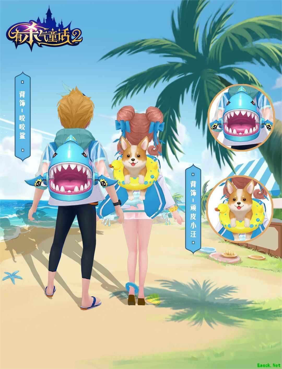 盛夏派对,逐浪而来!《有杀气童话2》周年庆泳装外观曝光,参与“童话扭扭乐”活动即有机会获得,还有夏日限定背饰-顽皮小汪“0元购”!立即上线获取,解锁你的夏日记忆! 惬意盛夏潮玩趴 火热开启! 时装【夏日逐浪】有男女两款,采取清新简约的蓝白配色。女性泳装标配的抹胸短裙搭配外层白纱,性感俏皮感满满,脚踝处泳圈尽显夏日特征!男性的紧身泳裤,完全衬托身材肌肉线条!不论海浪、岛屿、森林,愿身着时装的冒险者,都如有清凉海风相伴~