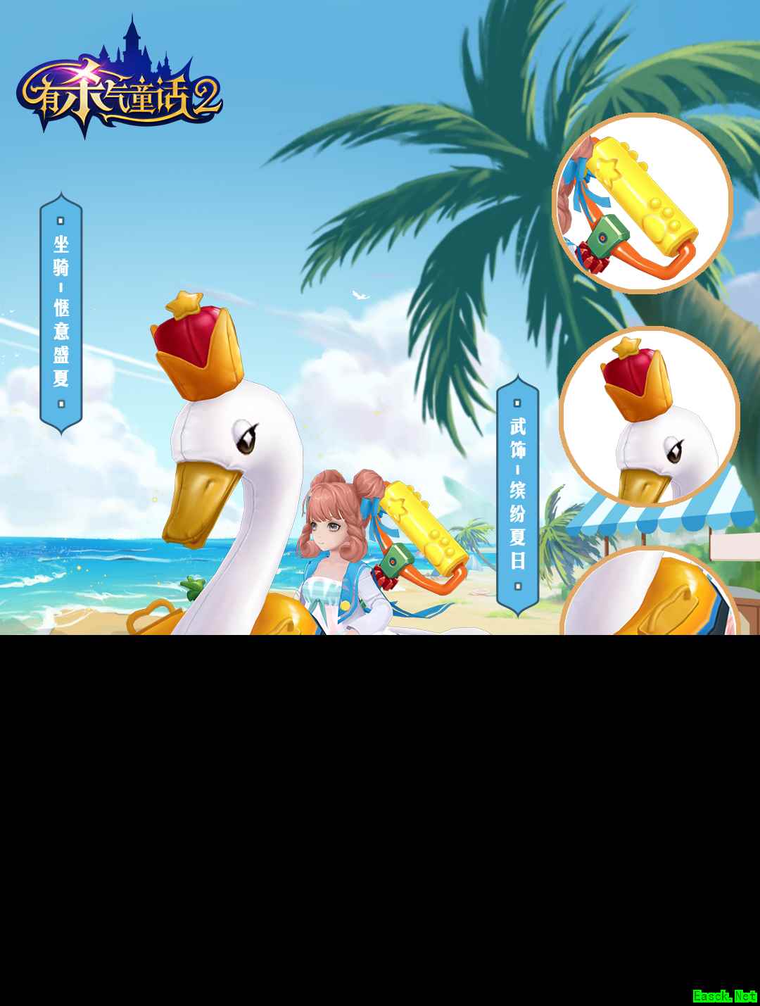 白天鹅泳圈【惬意盛夏】和武饰【缤纷夏日】,是为冒险者倾心打造的童年回忆。白天鹅头戴皇冠,佩戴脖子处的泳圈,Q萌感十足!!