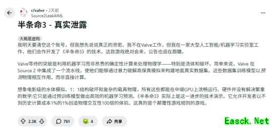 发帖者“Source2LeakAIML”表示,自己并非Valve员工,但所在的人工智能/机器学习研究机构正在与Valve合作,为《半条命3》开发新的物理模拟技术。该用户的身份与相关内容均未被独立验证。