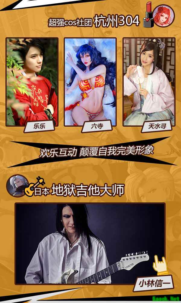 国内顶级cos社团杭州304的乐乐、天水寻、六寺三位大大突破次元壁,完美还原《终焉誓约》主角三人队,现场将与“日本地狱吉他大师”小林信一欢乐互动。3位Coser大大将会在小林信一狂热的七弦吉他演奏之下,颠覆自我完美形象!