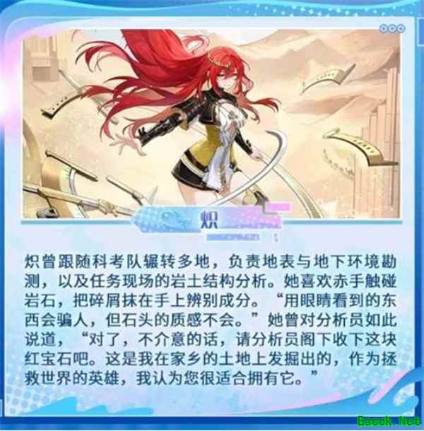 来自科考队的岩土分析员,擅长地表与地下结构勘测。她以赤手触碰岩石的方式辨识成分,坚信“大地不会说谎”。炽为分析员献上一块来自家乡的红宝石,象征守护与信任。