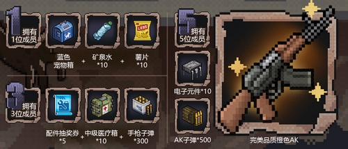 从今日起到游戏公测,预约《像素危城》并邀请好友加入避难所,达到1人/3人/5人,所有人都可以获得丰厚奖励,宠物、配件、水、食物、医疗物资应有尽有,为你提供最基础的生存保障!达到5人,还将每人赠送一把AK,助你大杀四方。