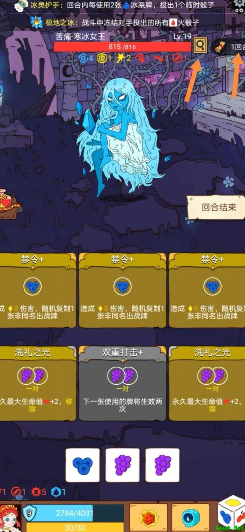 战斗开始时,可通过怪物血条右侧两个选项查看其初始卡组(不含罪恶之手)以及本局游戏的所有增益效果。