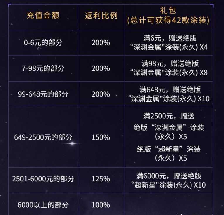 本次测试期间,充值任意金额,均可按照相应比例在公测时进行返还,返还奖励根据充值金额叠加获取,具体返还比例和礼包如下: