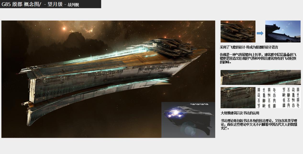 舰船的设计分阶段有序展开。从策划文档定稿伊始,美术团队第一时间召集成员,充分理解势力设定,并尝试提炼殷郡舰船的几大核心要素。