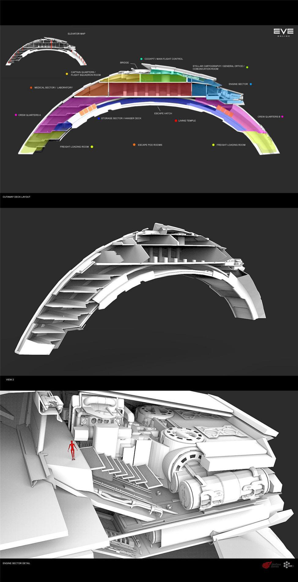 确定大致的功能分区之后,再开始设计室内装修。比如,下图为一位外国设计师对于东方势力舰船室内设计的想象: