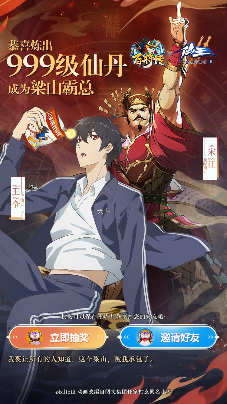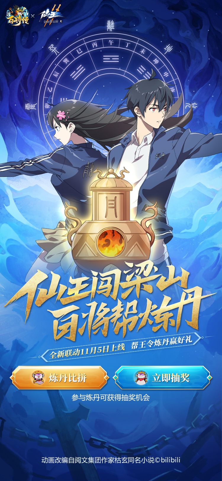 《小浣熊百将传》X国创动画《仙王的日常生活》联动将于11月5日热血开启!全新稀有英雄王令、孙蓉即将登陆梁山!仙王驾到,百将共战!