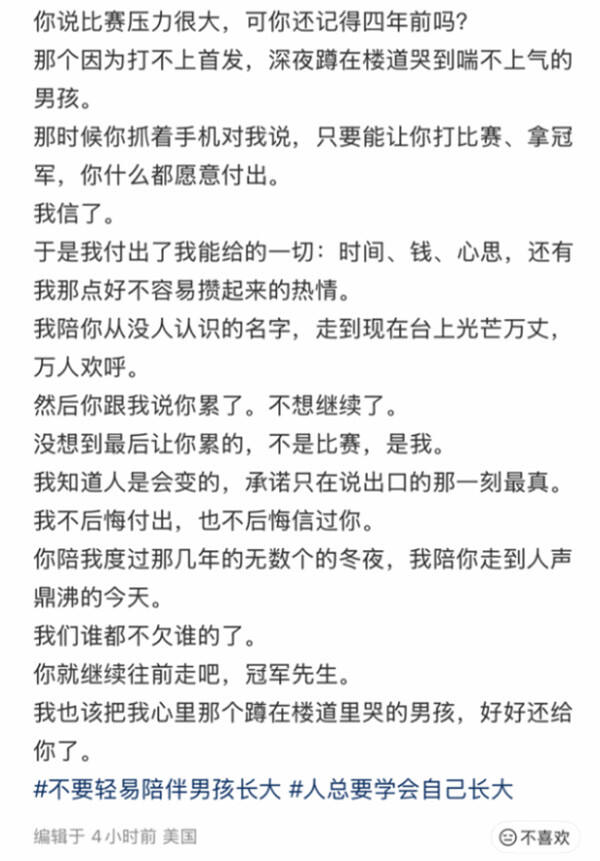帖子一经发出便迅速引爆舆论,“电竞冠军硬甩富婆女友”“百万转账喂大冠军男友” 等话题刷屏社交平台。有人将男方的行为解读为 “拒吃软饭”,认为他功成名就后不愿再依附女方金钱,选择果断切割以维护尊严,是有骨气的表现;但更多网友对这份 “单方面爆料” 提出质疑,直言 “小作文不可全信”,仅凭女方一面之词与转账截图难以还原真相,感情纠纷本是私事,拿出来公开晾晒难免有引导舆论、博同情之嫌。