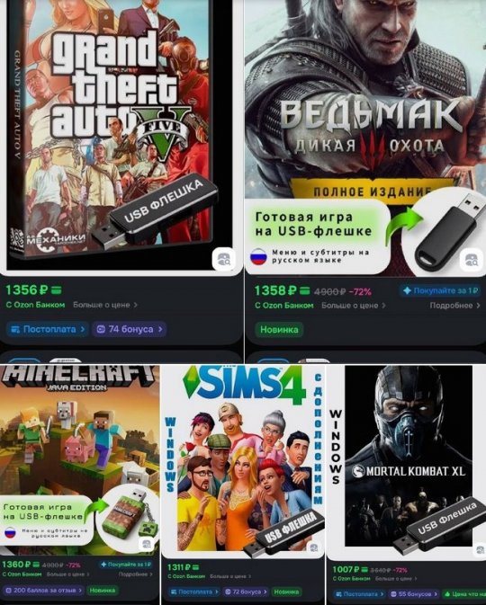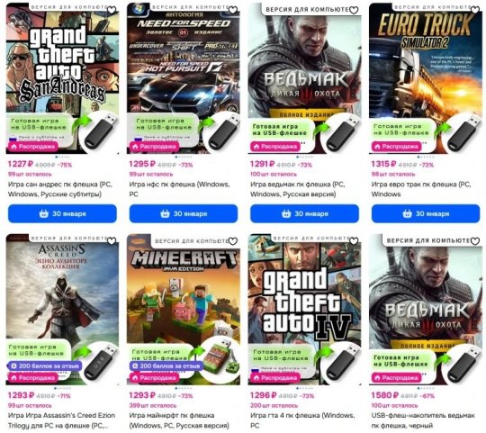 俄罗斯电商平台Ozon的用户注意到一种不寻常的游戏售卖形式。该平台目录中出现了购买往昔热门游戏的商品信息,这些游戏被预装在标准U盘中。其中最引人注目的商品之一是角色扮演游戏《巫师3:狂猎》,名为"БЕРИ ПРОСТО"的卖家以约1300卢布(约合人民币119元)的价格出售。