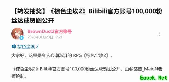 由Neowiz发行的二次元RPG手游《棕色尘埃2》(Brown Dust 2)Bilibili官方账号正式宣告粉丝量突破10万大关,并同步释出了极具诚意的粉丝达成贺图。