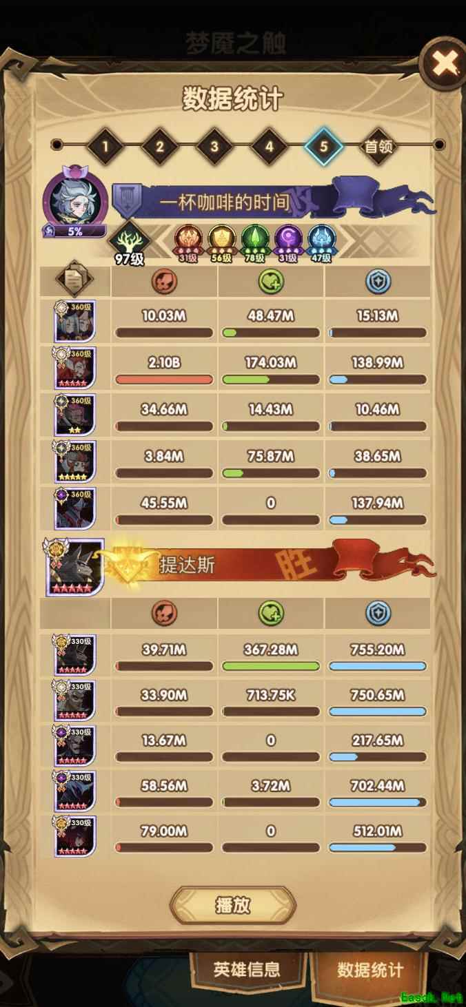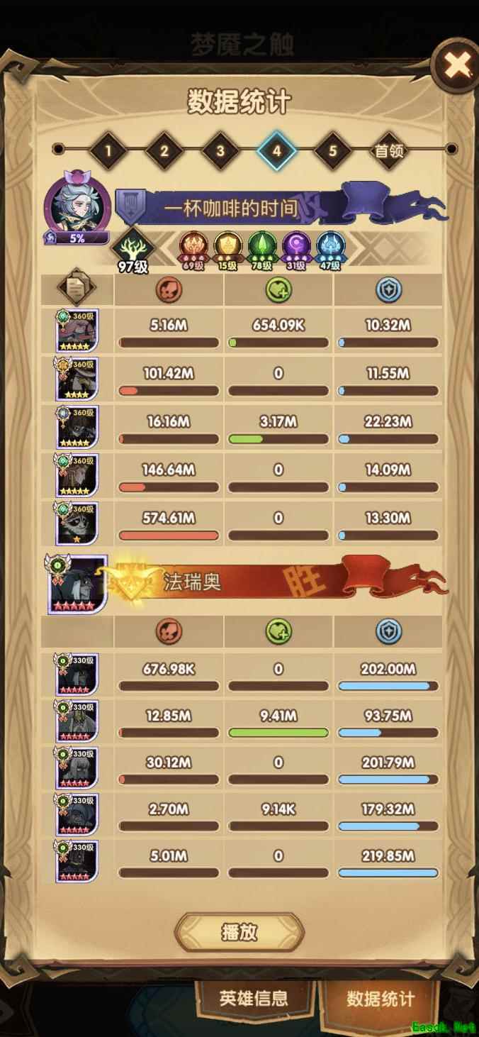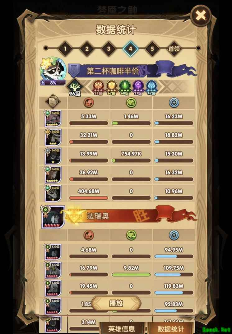 第四队实际采用的是周三分享的绿意阵容,但由于小浣熊刻印等级较低,比一号号低了400M到500M伤害,目前只能打出400至500M的输出,若刻印升至44级,伤害可提升至800M到1B。