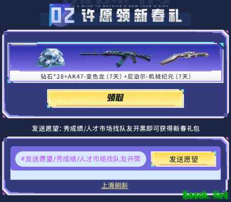 点击 “领取” 即可直接获得包含钻石与限定枪械的基础礼包,发送愿望(秀战绩 /在人才市场找队友开黑)还能解锁额外新春礼包,轻松收获更多实用道具,在战场中更具竞争力。