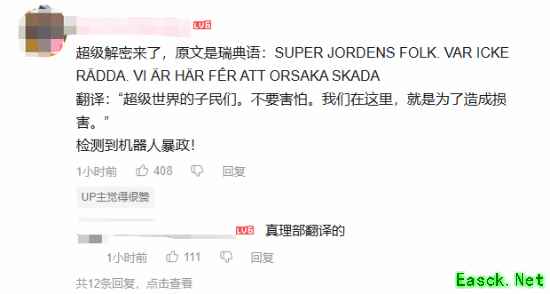 说正经的,这两段都是用ASCII码加密后的瑞典语,翻译一下就是:“超级世界的子民们。不要害怕。我们在这里,就是为了造成损害”,以及“我们被你们的领导者欺骗了。他们说的话不是真的。我们想要和平。”