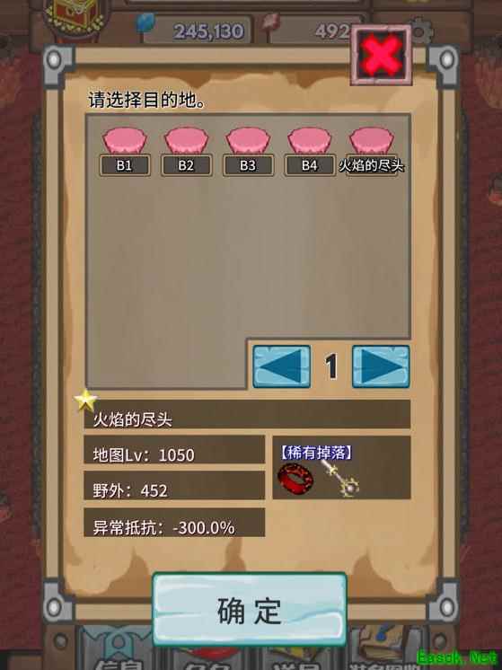 反复刷怪升级装备,优先将优质铁换成免伤百分比,依次通关至熔岩5层,并完成全部沙漠关卡。