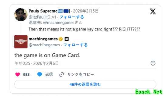 ·看来工作室也很明白玩家的烦恼,直接回应称不使用Key卡,只用游戏卡,因为本作的移植后容量约为59.7GB,真的太顺应玩家民意了。