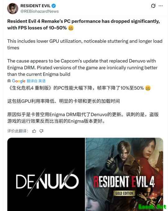 《生化危机4:重制版》最近突然更新,PC版Capcom用新的DRM取代了D加密。尽管D加密有很多缺点,但似乎并没有许多人说的那么糟糕,因为新的DRM——Enigma更甚,严重影响了《生化危机4:重制版》的性能。