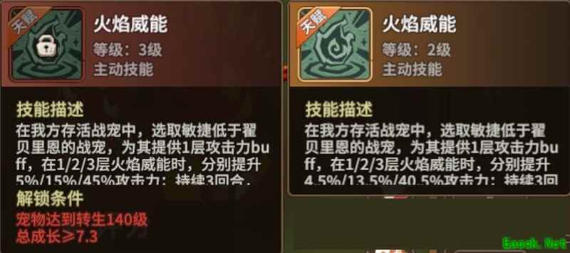 火焰威能效果:当己方存活战宠的敏捷低于翟贝里恩时,可获得1层攻击力增益。在1/2/3层火焰威能状态下,攻击力分别提升4.5%、13.5%、40.5%(若为3级则分别为5%、15%、45%),效果持续3回合,即使战宠被击败,该增益也不会消失。