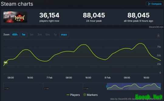 据SteamDB统计数据显示,《仁王3》Steam在线峰值为88045人,而《噬血代码2》Steam在线峰值仅为11499人,表现平平。《仁王3》也成为了光荣特库摩登陆PC平台热度最高作品。