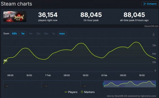 据SteamDB统计数据显示,《仁王3》Steam在线峰值为88045人,而《噬血代码2》Steam在线峰值仅为11499人,表现平平。《仁王3》也成为了光荣特库摩登陆PC平台热度最高作品。