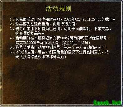 注意事项:1.只有完成预创建角色的账号,才可以获得绿通资格与挥金如土称号!2.游戏内元宝兑换传奇币不计算在“预充值”内。
